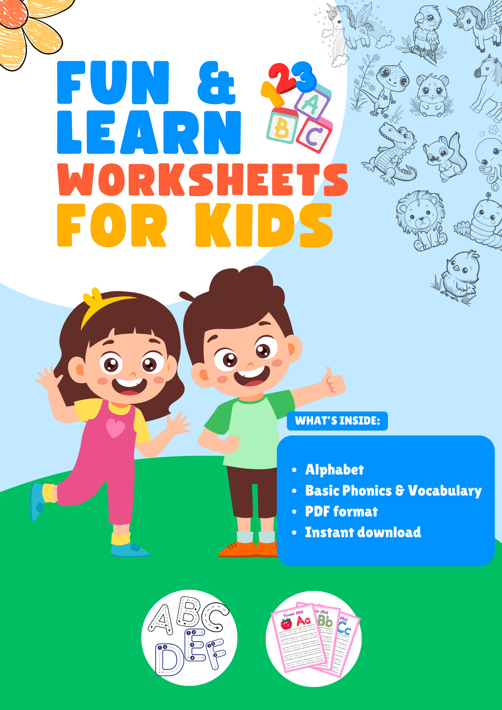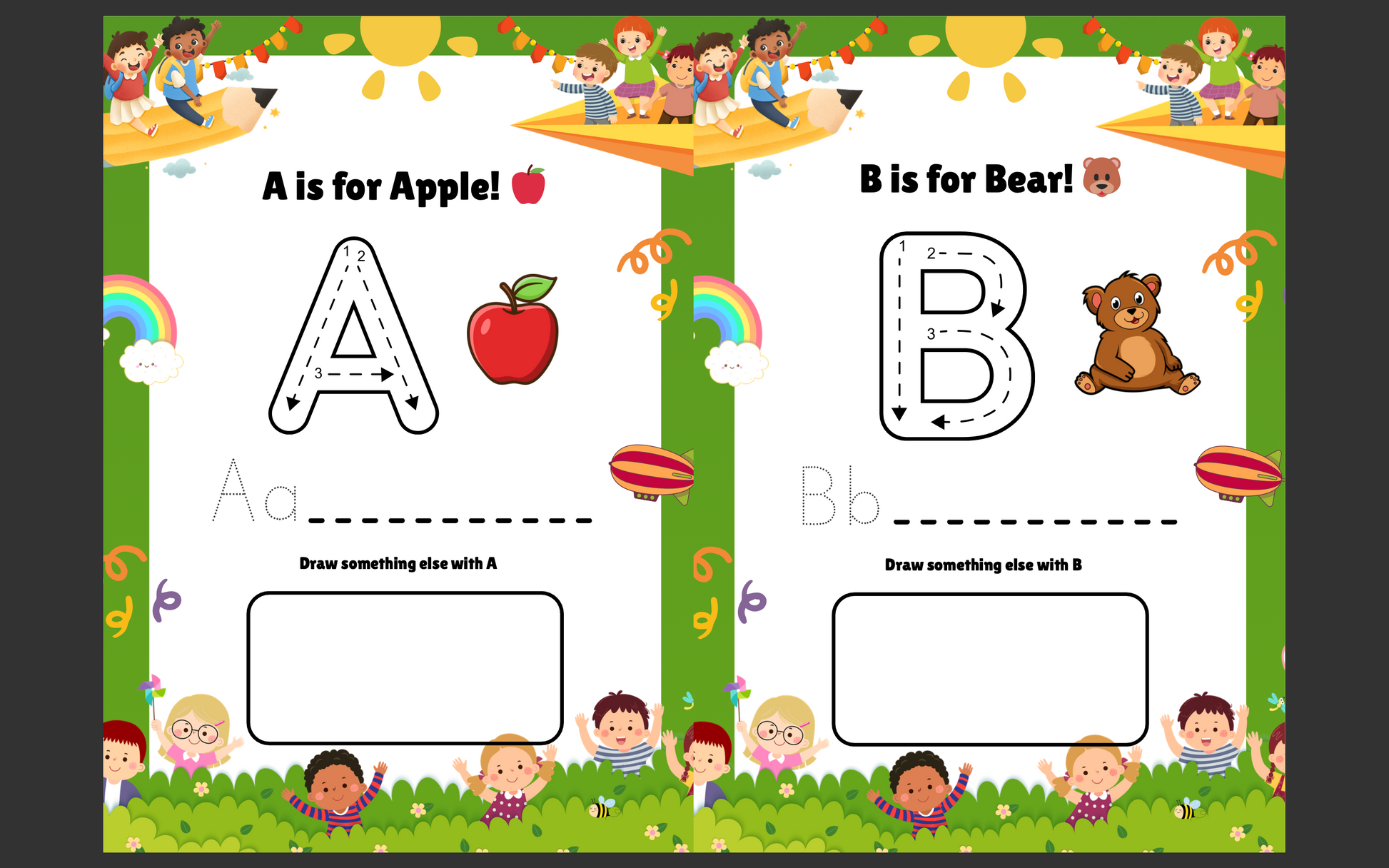 📘 Alphabet Coloring Book (28 pages) – Each page introduces a letter of the alphabet with cute illustrations to color, helping children recognize letters while having fun.